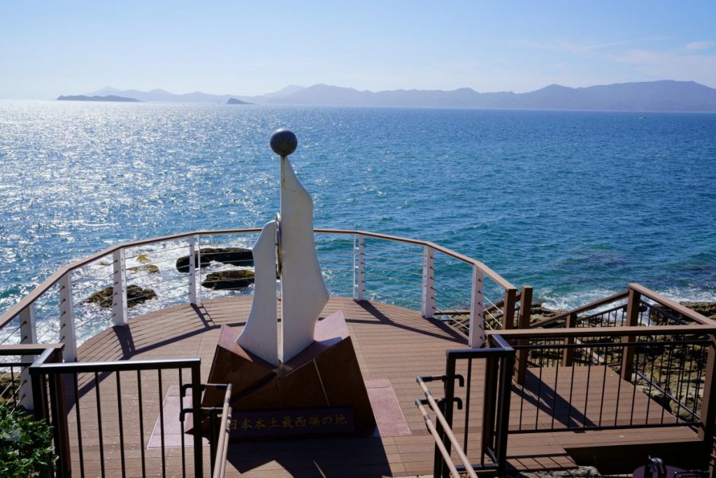 神崎鼻は1989(平成元)年、国土交通省の特別機関である国土地理院によって日本本土最西端の地に認定されました。長崎県北西部の佐世保市九十九島から平戸島、そして五島列島にかけて広がる大小400余りの島々からなる多島海景観が特徴の国立公園「西海国立公園」の区域に含まれるスポットのひとつで、神崎鼻の展望広場からはどこまでも広がる大海原と平戸島、五島列島を眺めることができます。