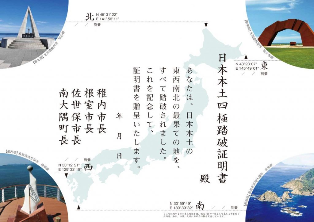 日本本土四極とは、「宗谷(そうや)岬」(北海道稚内市)、「納沙布(のさっぷ)岬」(北海道根室市)、「神崎鼻(こうざきばな)公園」(長崎県佐世保市)、「佐多(さた)岬」(鹿児島県南大隅町)の4カ所を、沖縄と離島を除く国内の東西南北の最端と定め、到達者への「日本本土四極 最○端 出発・訪問・到達証明書」や「日本本土四極踏破証明書」(出発・訪問・到達証明書の裏面)の発行、各自治体の首長による会合など自治体間での連携が進められています。