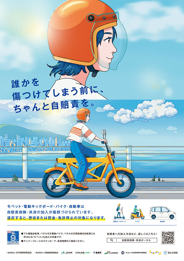 国土交通省(以下、国交省)は毎年9月を「自賠責制度広報・啓発期間」と定め、自賠責制度の重要性や役割、無保険車運行の違法性等について広報・啓発活動を集中的に実施し、自賠責保険・共済への加入促進を図っています。近年は電動キックボード(特定小型原付)やモペッド(ペダル付き原付) など新しいモビリティが普及し、利用者層も拡大しています。そのため「すべての対象車両で自賠責加入が必要」という基本を改めて呼びかけています。