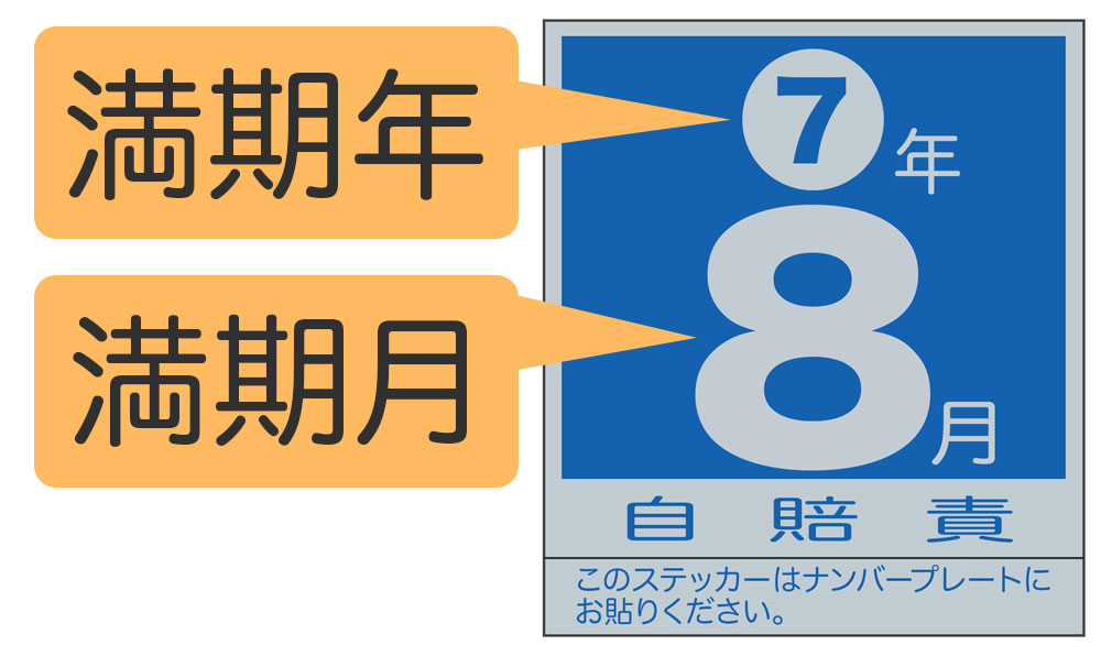 ステッカーには「満期年」「満期月」が記載されており、こちらが自賠責保険・共済の満期日を示しています。上記画像の例では「令和7年8月」と記載されているため、令和7年9月の時点で自賠責保険・共済の加入期限が切れていることになります。この場合は速やかに更新手続きをしましょう。