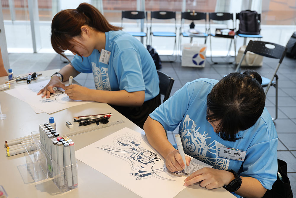 デザイン画を手書きする技術が「フィジカルスケッチ」です。バイクデザインにもCG(コンピューターグラフィックス)が活用されていますが、初期のアイデア出しにはフィジカルスケッチを行います。この講座では、自分のイメージするバイクを紙に描き出すカリキュラムと、バイクの線画にアルコールマーカーで着色して仕上げるカリキュラムのいずれかが選べました。インストラクターはスズキのデザイナー陣が担当しました。