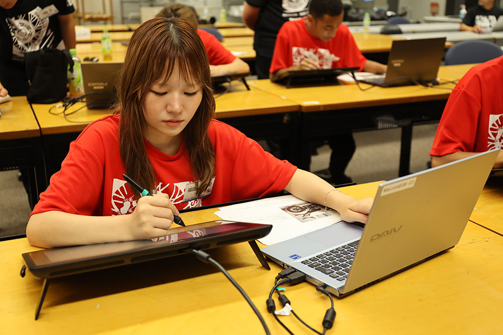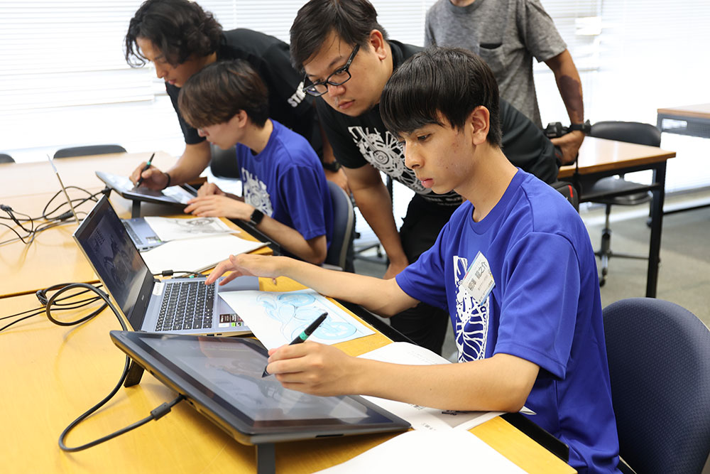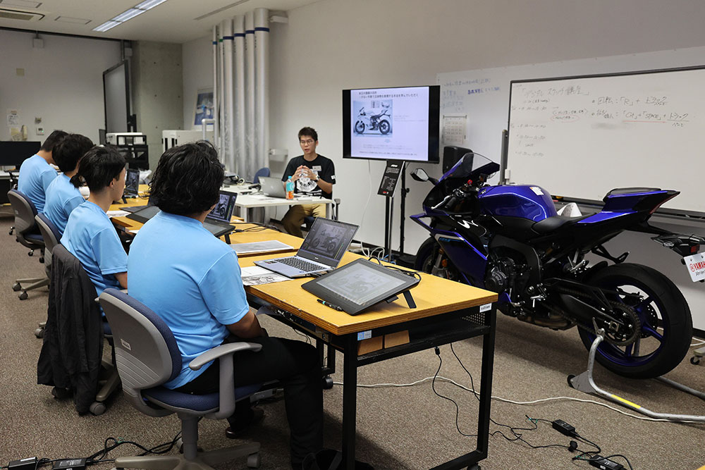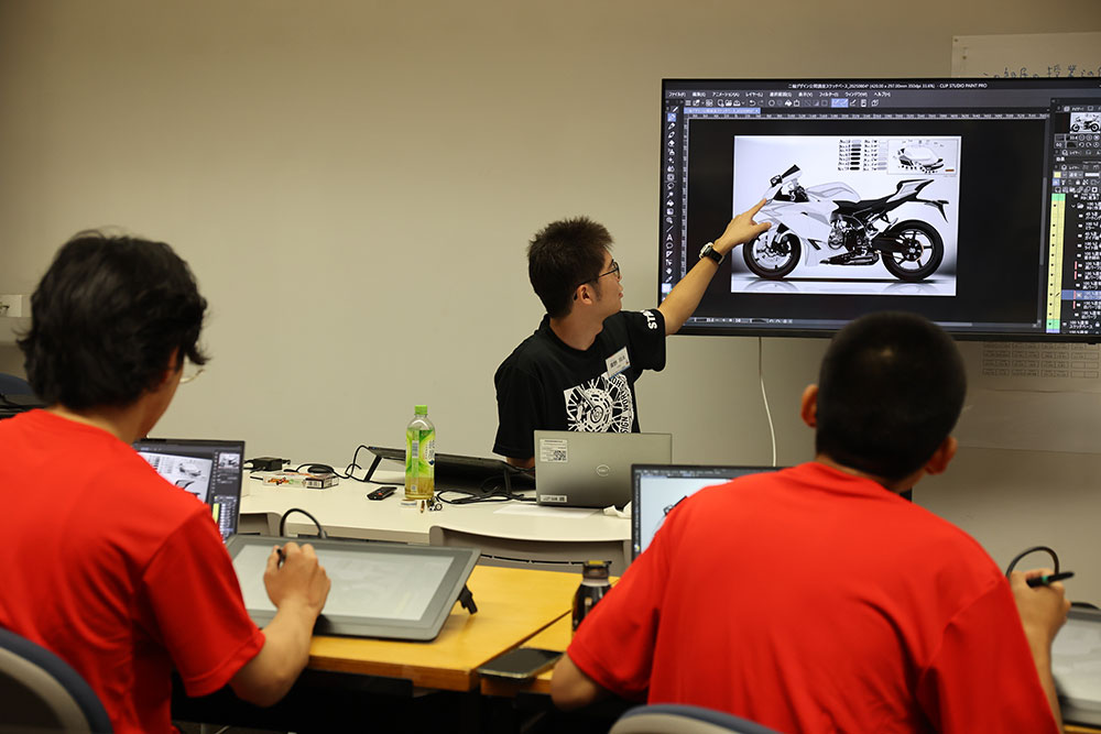 「デジタルスケッチ」では、プロ向けのソフトウェアを搭載したパソコンやタブレットを使用し、CGでバイクデザイン画を作成します。用意されたデザイン見本に合わせて描き上げていくカリキュラムで、CGの経験者はインストラクターの指導のもと、どんどん自作デザイン画を仕上げていました。インストラクターはヤマハとGKダイナミックスのデザイナーが担当しました。