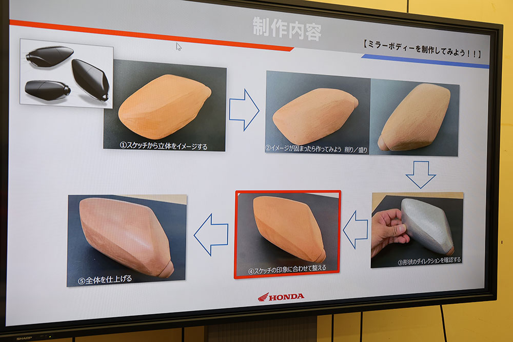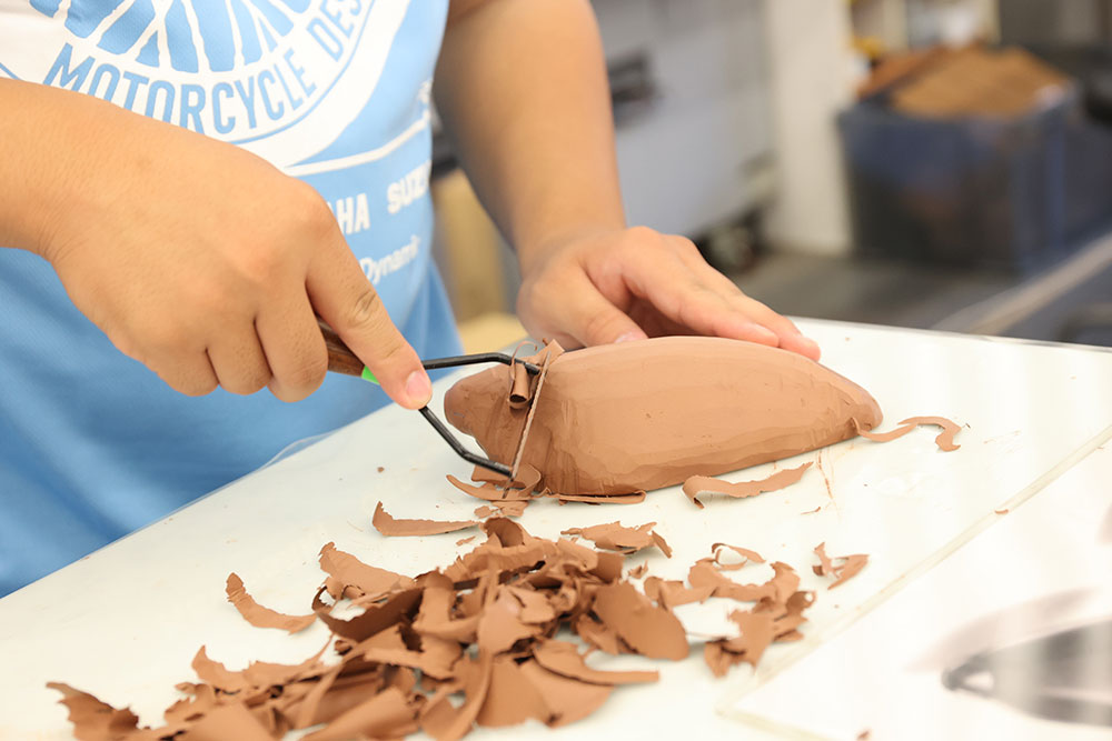 「クレイモデリング」では、インダストリアルクレイと呼ばれる特殊な樹脂粘土を使用してバイクの立体モデルを作ります。今回は、あらかじめ粗く成形されたバイクのミラーパーツのクレイが用意され、工具で削ってデザインを作り上げるカリキュラムでした。粘土での加工が初めてという受講生が大半でしたが、自分の手で立体的な作品をつくる楽しさを体感していました。インストラクターはホンダのデザイナーが担当しました。