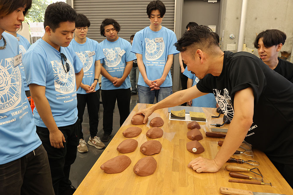 2日目は、カワサキ、スズキ、ホンダ、ヤマハの国内バイクメーカー4社と、バイクデザインを請け負うGKダイナミックスに所属するバイクデザイナーがインストラクターを務める実践講習会が開催されました。「フィジカルスケッチ」「デジタルスケッチ」「クレイモデリング」「CMF(Color[色]、Material[素材]、Finish[仕上げ]の頭文字を取った最終工程のこと)」の4工程を体験しました。