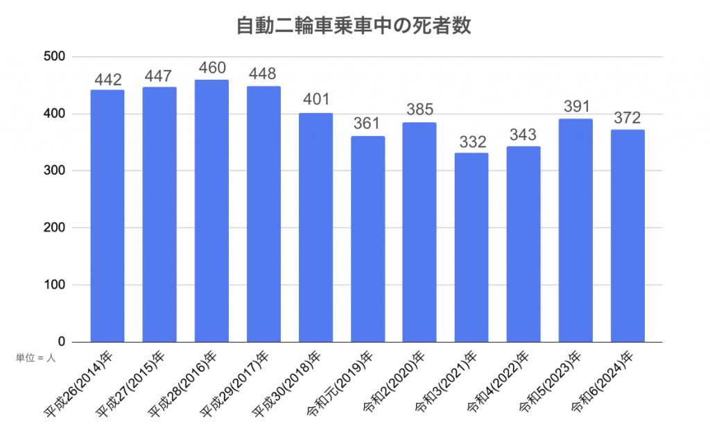 バイク乗車中の交通事故での死者数は、令和5年と比べるとやや減少したものの、令和6年中は年間で372人の方が亡くなっています。「事故に遭わず無事に帰ってきてほしい」と願うご家族のためにも、普段以上に安全運転を心がけましょう。