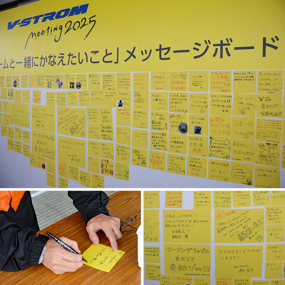 車両展示コーナーの奥には、「Vストロームと一緒にかなえたいこと」というテーマが掲げられた大きなメッセージボードが用意されました。来場者はそれぞれの想いを黄色いメッセージカードに記し、ボードに貼り付けていました。