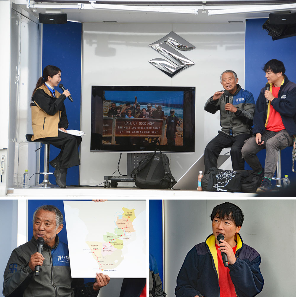 ツーリング期間は約1カ月、総走行距離が約8,000kmという壮大なアフリカ大陸縦断ツーリング企画。ルートの詳細をはじめ、立ち寄った国々の風景や食事、現地の人々との交流、さらにはトラブルまで、動画と写真を交えて紹介されました。今回のトークショーのために現地写真の手配や情報収集、帰国した同氏を空港まで迎えに行くなど賀曽利氏を陰ながらサポートした舛木氏からは、道中のこぼれ話や裏話も披露され、会場からは笑い声が上がる和やかなトークショーとなりました。