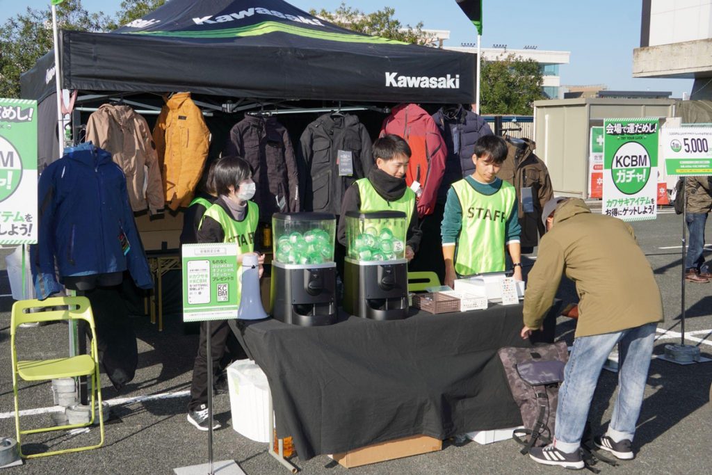コーヒーと同じぐらい長い行列ができていたのは、「KCBMガチャ!」と呼ばれる企画です。カワサキのオリジナルグッズが当たるカプセルトイで、1回5,000円とやや高額ですが、必ず5,000円以上のアイテムがもらえるのでとてもお得です。今回の最高額商品は、定価50,000円以上のライディングジャケットでした。