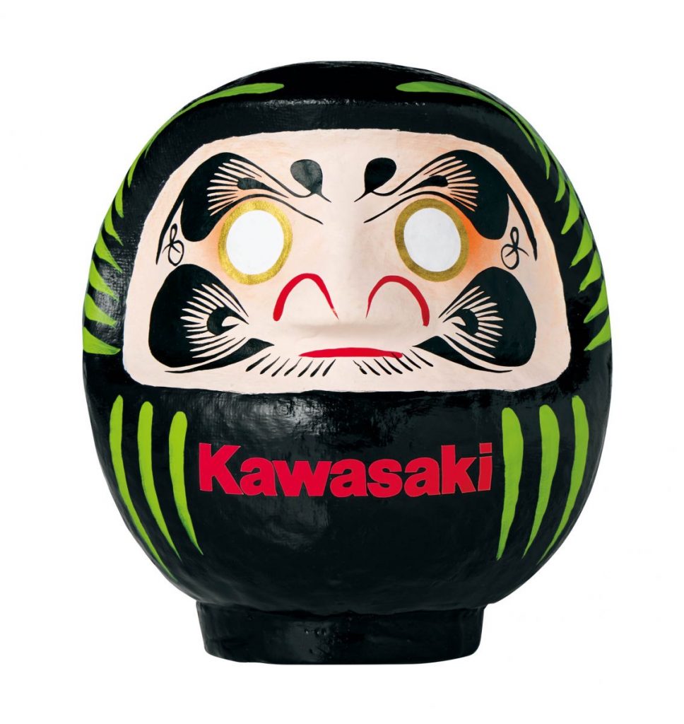 ブラックのボディにライムグリーンのラインと赤の「Kawasaki」ロゴが映える、群馬県高崎市で作られている「高崎だるま」とのコラボアイテム。サイズは高さ約120mmで、ガレージの守り神として圧倒的な存在感を放ちます。自分で目を入れるための目玉シールが付属しており、目標達成や安全祈願の縁起物として最適です。