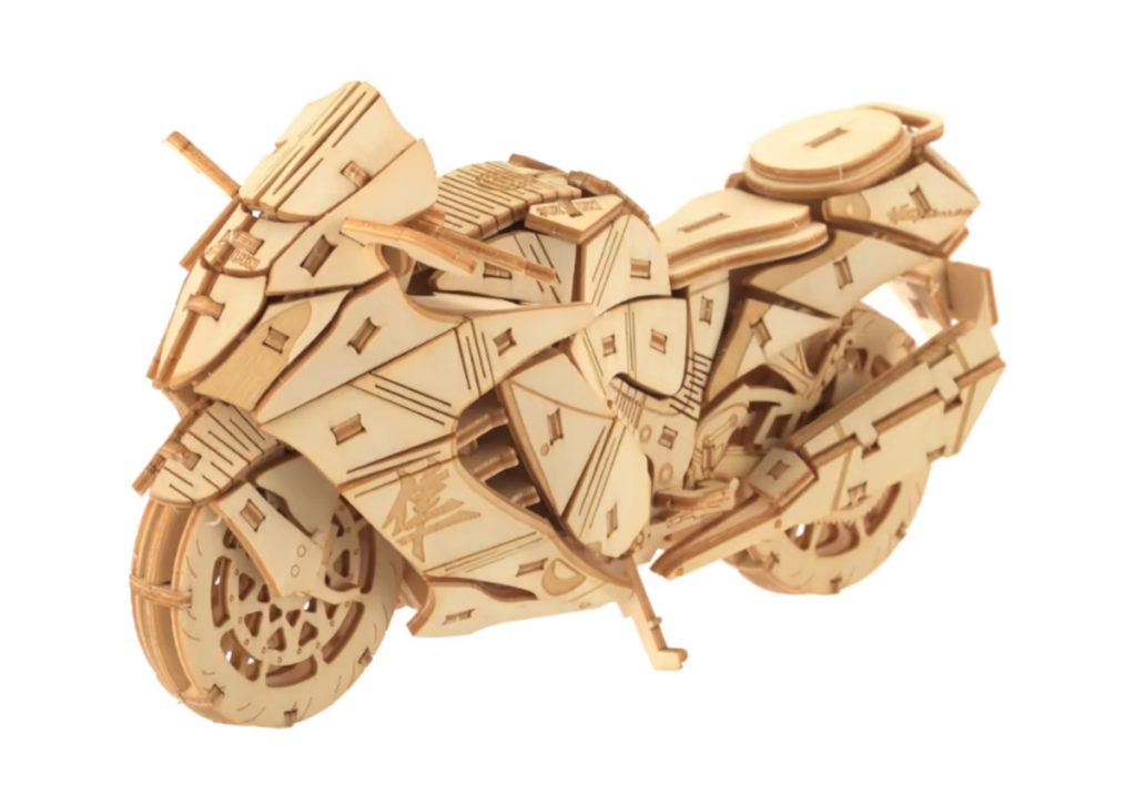 ハサミや接着剤を使わずに、板からパーツを切り離して組み上げられる木製パズルです。「Hayabusa」などの特徴的なカウルラインを木製ならではの質感で再現しており、組み立ての過程からインテリアとしての完成後まで長く楽しめます。