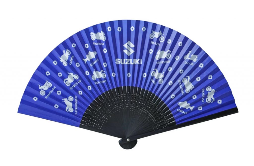 夏場のイベントやサーキットでのレース観戦に欠かせない、スズキ公式デザインの扇子。「SUZUKI」ロゴと、スポーツバイクの代名詞「GSX-R」ロゴの2タイプがあり、和の伝統美とモータースポーツの熱狂が融合したデザインが魅力です。
