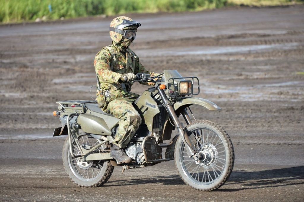 陸上自衛隊ではカワサキ「KLX250」を採用しています。作戦行動用に無線機ラックや、転倒時の破損を防ぐガード類を装備しているのが特徴です。