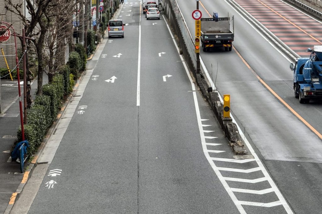 標識やカラー舗装で区切られた「専用レーン」は、道路交通法上の車両通行帯です。ここはバイクや自動車の通行が原則禁止であり、走行し続けると「通行帯違反」に問われる可能性があります。